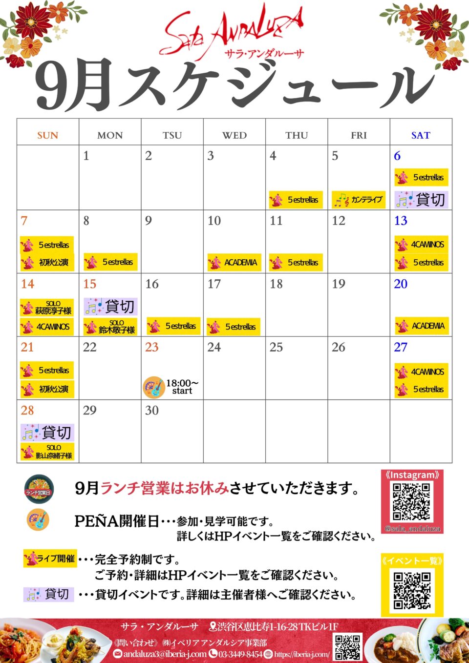 【9月】サラアンダルーサ スケジュールのお知らせ